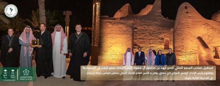 استقبل صاحب السمو الملكي الامير فهد بن منصور آل سعود رئيس الإتحاد سفير تايلند في السعودية. برفقتهم رئيس الإتحاد الروسي للمواي تاي دمتري بولتن و الأمين العام للاتحاد الدولي ستفين فوكس بجولة وعشاء في المدينة التراثية طريف.