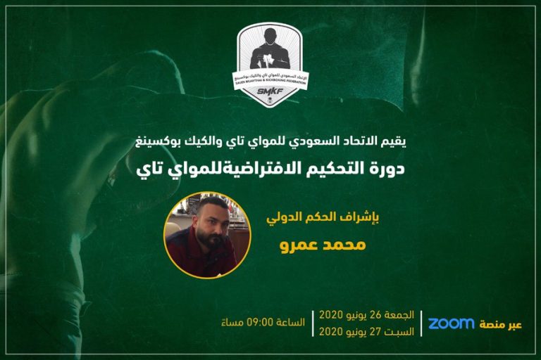 يعلن الاتحاد السعودي للمواي تاي والكيك بوكسينغ عن إقامة دورة التحكيم الإفتراضية للمواي تاي بإشراف الحكم الدولي محمد عمرو خلال الفترة من 26-27 يونيو 2020 عبر برنامج Zoom في تمام الساعة 9 مساءً
