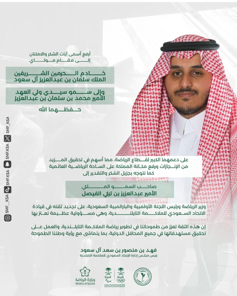 نهنئ صاحب السمو الملكي الأمير فهد بن منصور بمناسبة تمديد رئاسته للاتحاد السعودي للملاكمة التايلندية ، متمنين له دوام التوفيق والنجاح