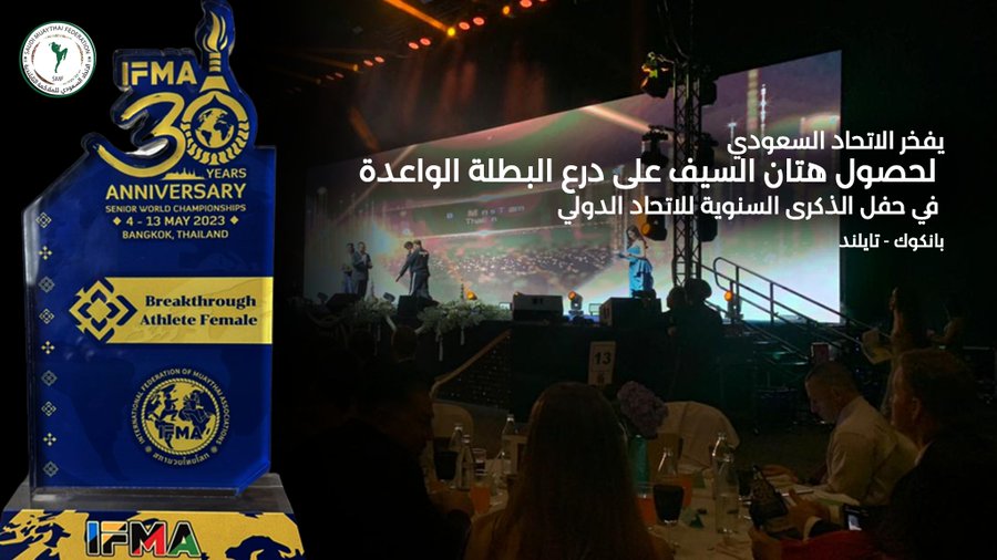 يفخر الاتحاد بالبطلة هتان السيف لحصولها على درع البطلة الواعدة في حفل الذكرى السنوية الثلاثون للاتحاد الدولي للملاكمة التايلندية في